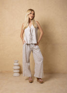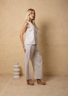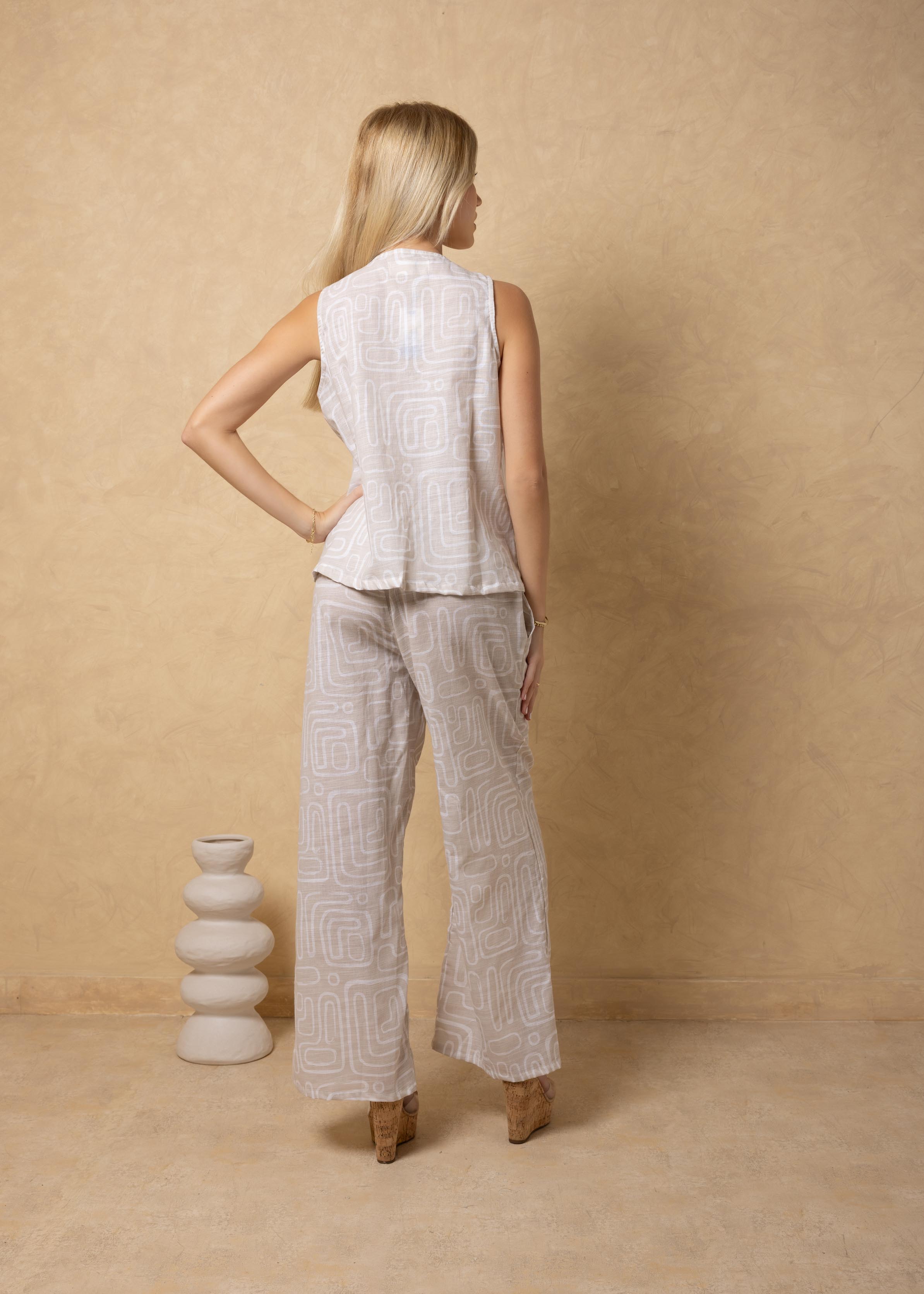 NW2067 - Light Beige Lines Print Tie-Front Vest Cotton Top